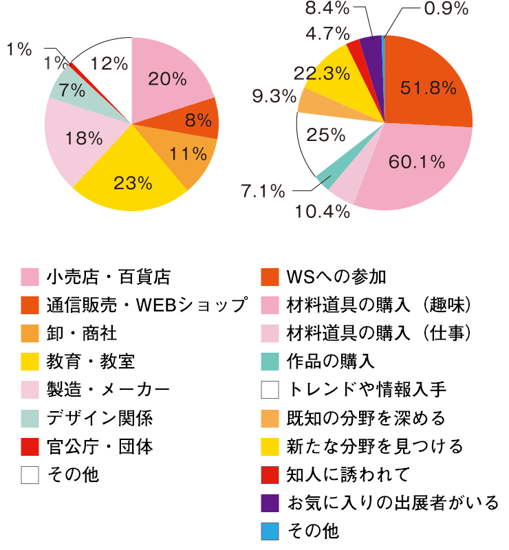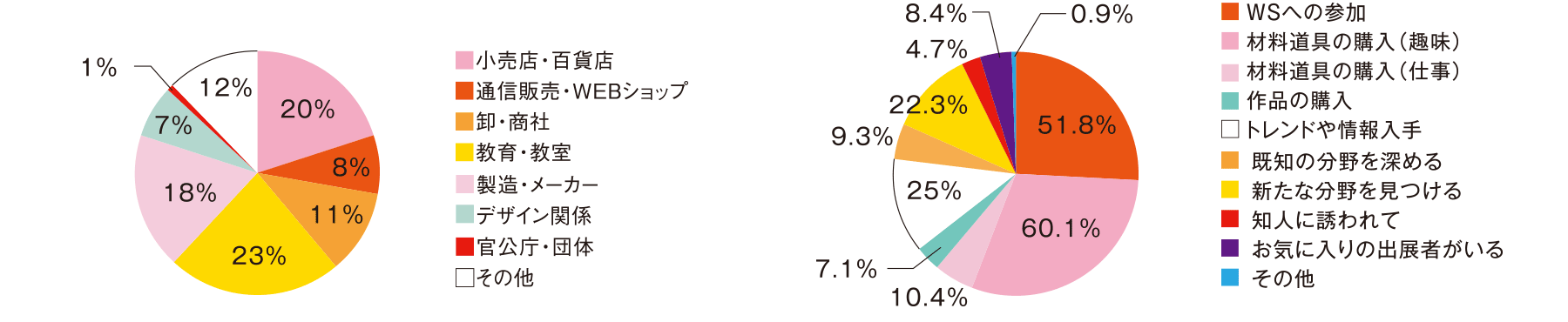 作品の展示や発表、ワークショップやデモンストレーションで感性や技術を伝え、ものづくりを発信するエリアと、ハンドメイド作品が販売できるエリアに分かれています。