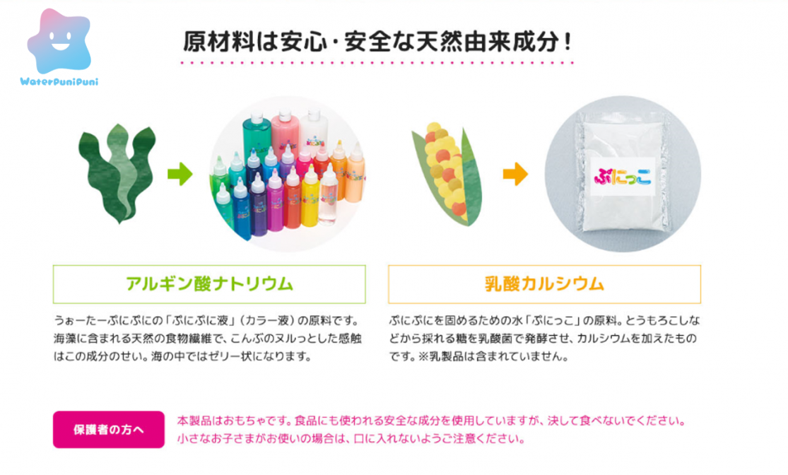 「うぉーたーぷにぷに」は海藻とトウモロコシ澱粉由来の成分で作ったおもちゃです。