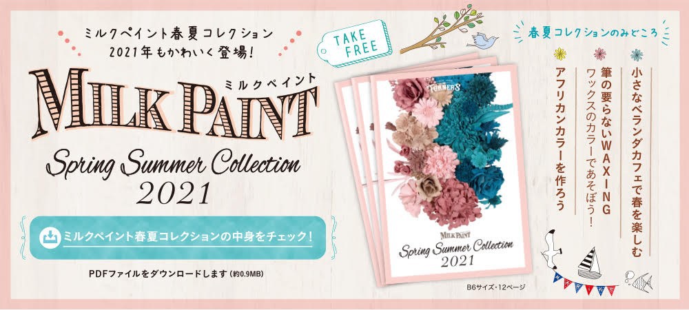 新しいペイントDIYの世界を感じられる「ミルクペイント春夏コレクション2021」の冊子や作例などを展示しております。