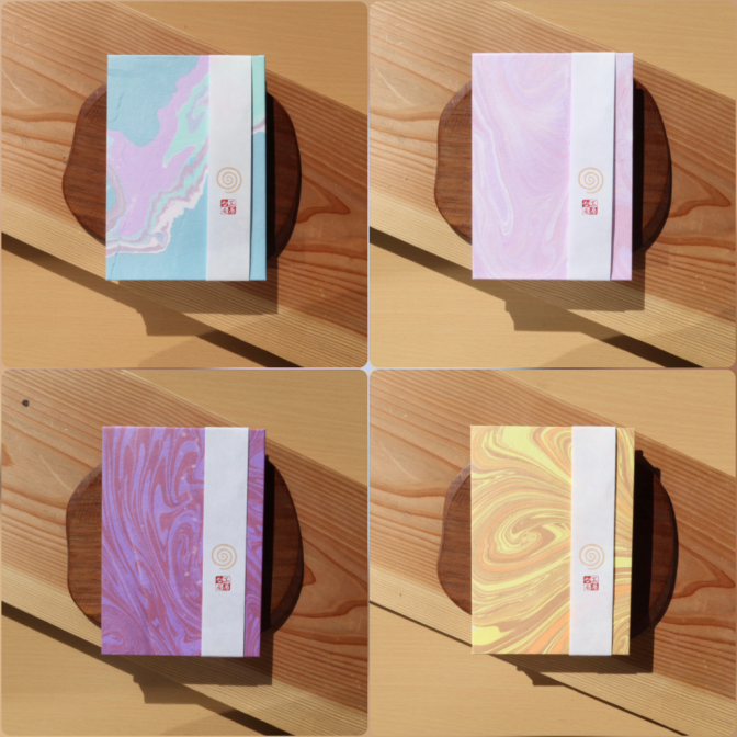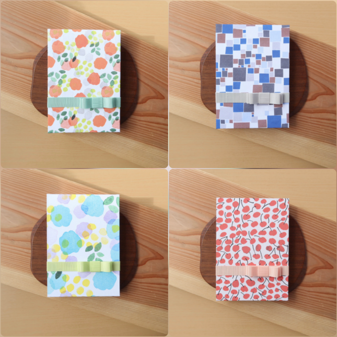 紙は、和紙・海外の手漉き紙・千代紙・オリジナルの墨流し・エンボス加工にリボン、じょあんオリジナルのエンボスなど。