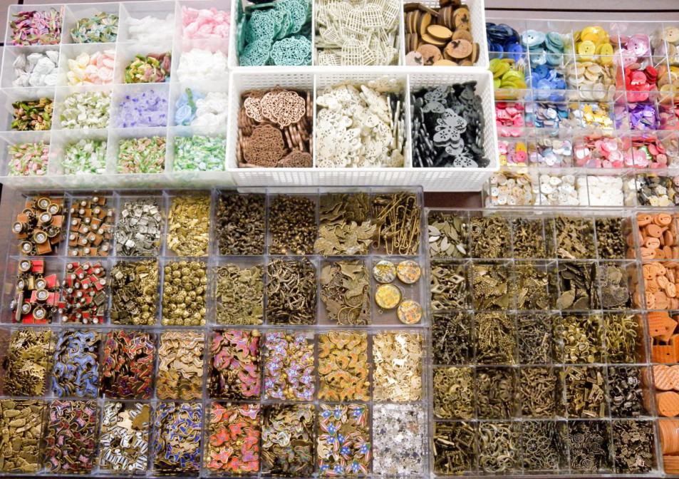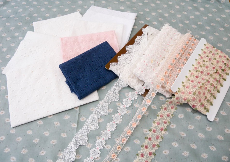 マスクや小物作りで活躍しそうなレース生地のカットクロスやレースやたくさんの種類のパーツ、