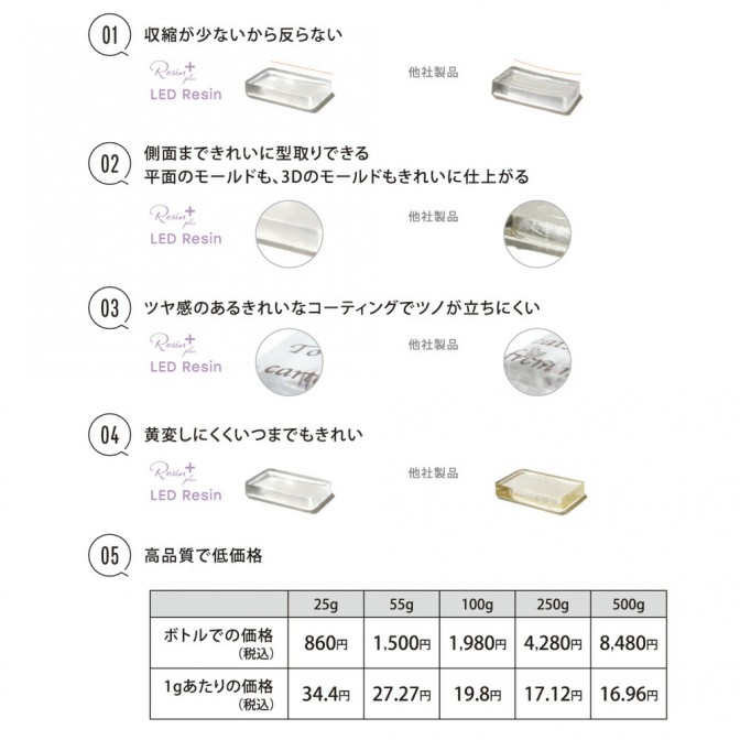 そして、それらを追求するために品質にも価格にもこだわったのがResin+シリーズの「LEDレジン」。