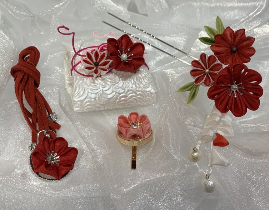 伝統工芸つまみ細工保存会定番の革紐ネックレスです。可愛く作って胸元を飾ってください。