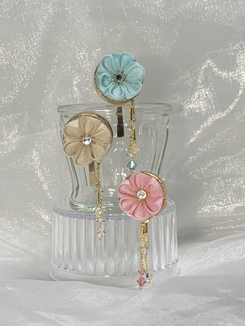 ポニーテールに挿すだけの可愛いヘアアクセサリーです。シリコンチューブ付きなので胸元やバッグにも付けられます。
