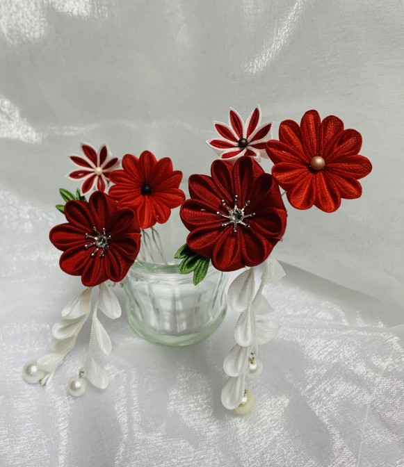 本格的つまみ細工のかんざしです。今年は浴衣姿に是非付けてください。金具が2本足かんざしかコームどちらか選べます。