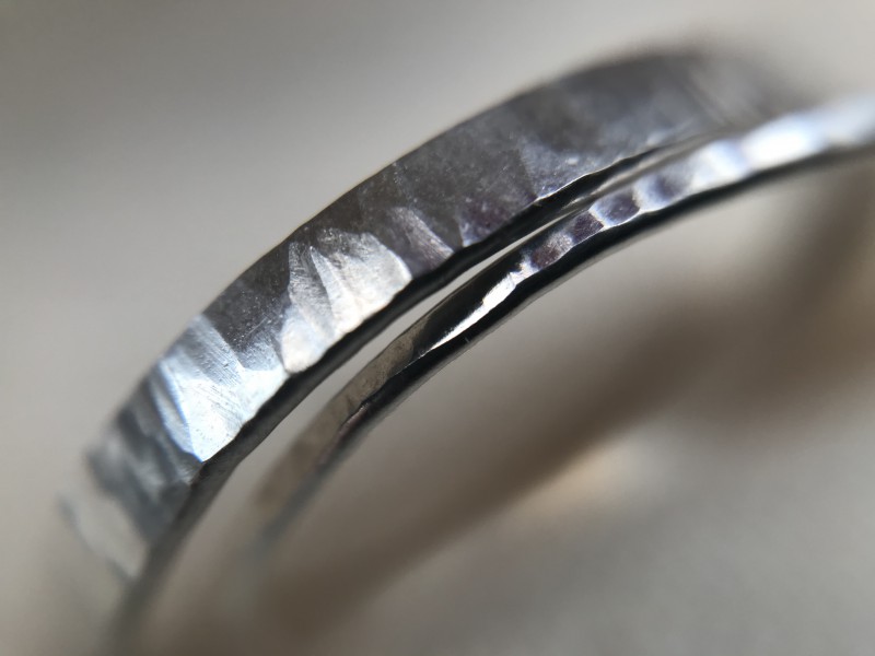 するとカナヅチのピカピカが打ったところにうつり、全体をたたいていくことで鏡面のカナヅチの跡を模様にしていく、金属工芸の伝統技法です。