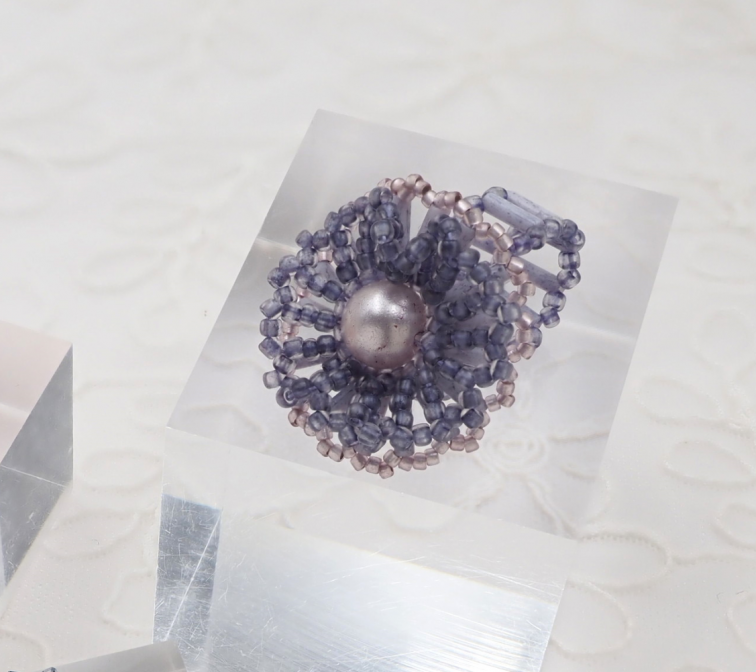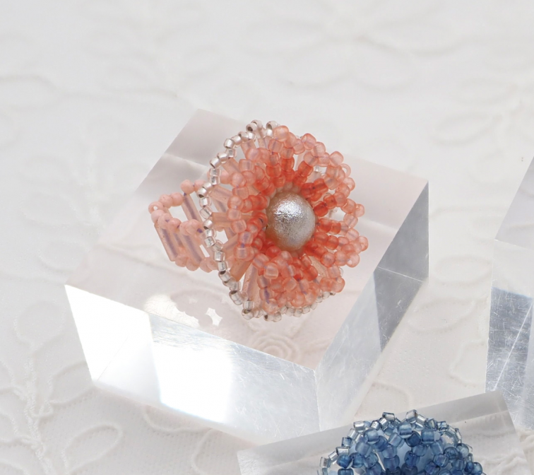 丸小と竹ビーズで二枚重ねの花モチーフリング。