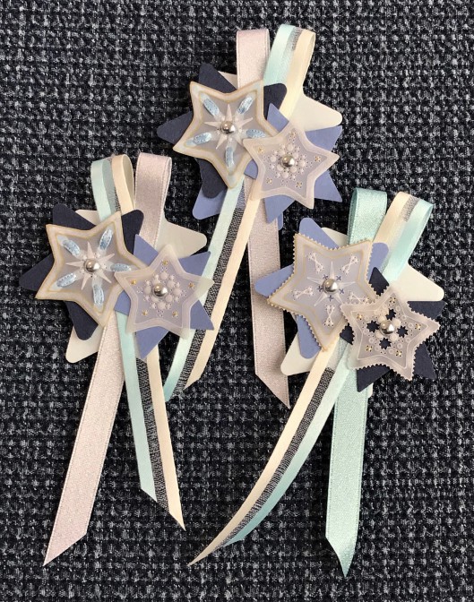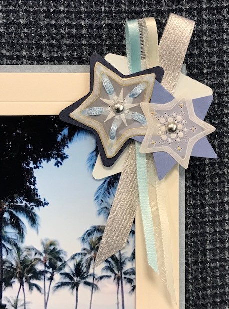 リボンでまとめるスターコサージュと、コーナー模様の2パーツを作成、好みのカラースターを飾り、取り外し可能のコサージュをアレンジして2面の写真フレームを飾って仕上げます。