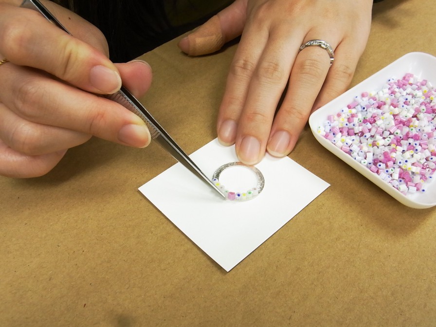 ただし、使用するミルフィオリ(ガラス粒)が2~3mmサイズ、4~6mmサイズと小さいので、老眼鏡をご使用の方はお持ちください。