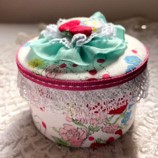 円筒形のボックスにかわいい生地を貼り、蓋をレースなどで飾り付けます。内側はスウェード調の生地を貼り高級感もあります。