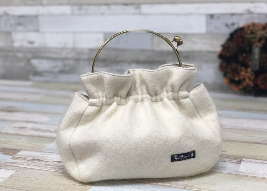 出来上がっているウールかばんにがま口金具を通すだけで完成です。