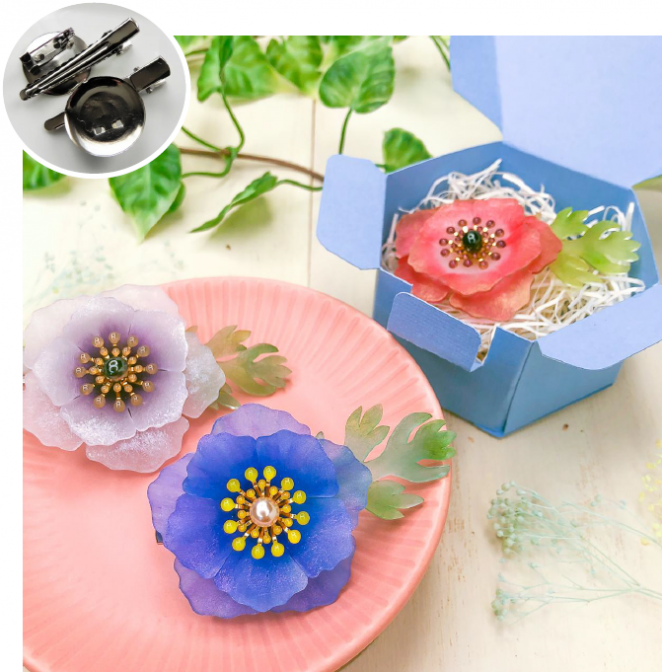 スキャンカットで緻密に美しくカットしたプラバンを使い、ナナアクヤさんならではの着色や成形テクニックの指導で、軽やかで鮮やか・きらめきのある「アネモネのコサージュクリップ」を作ります。